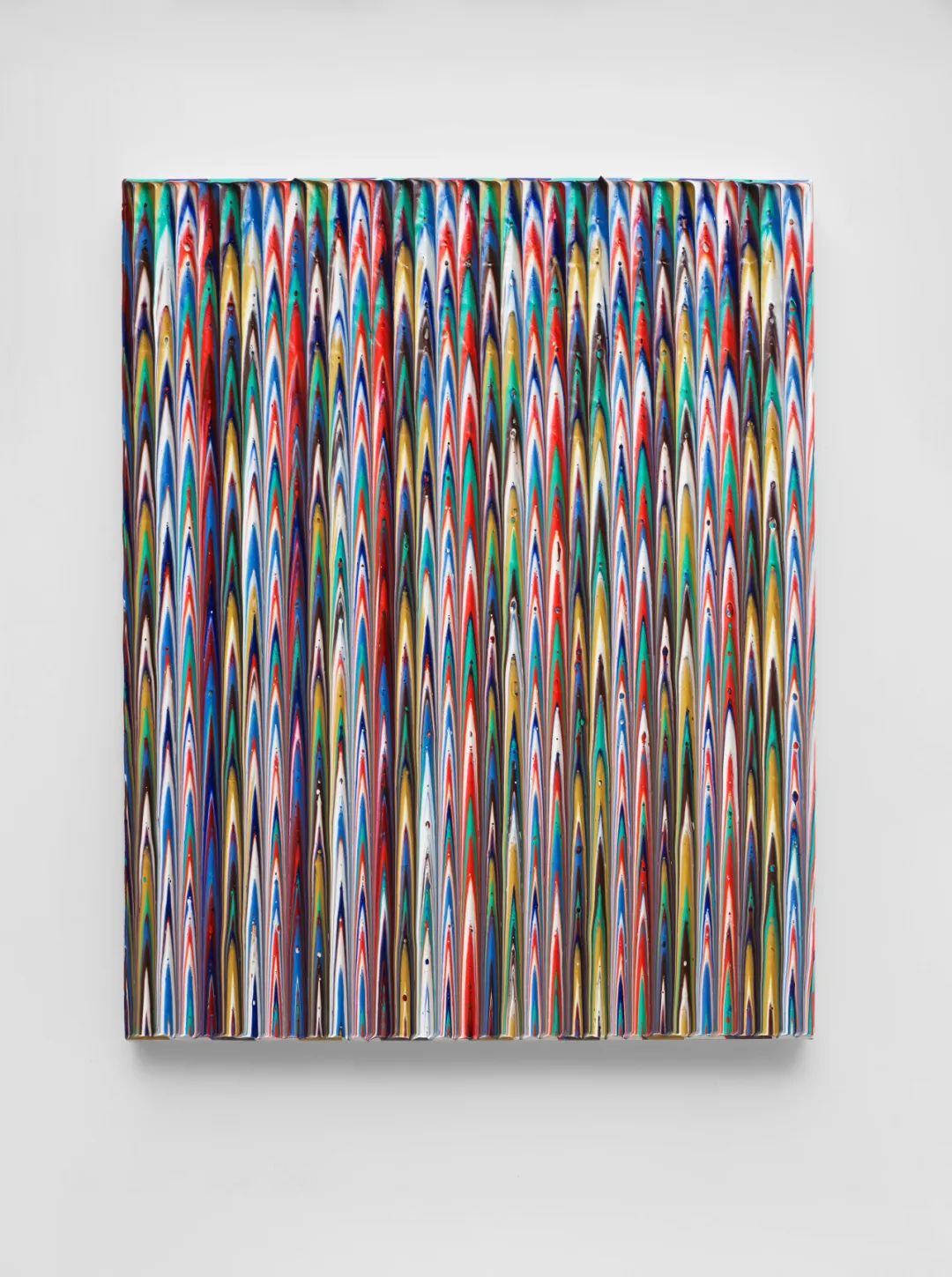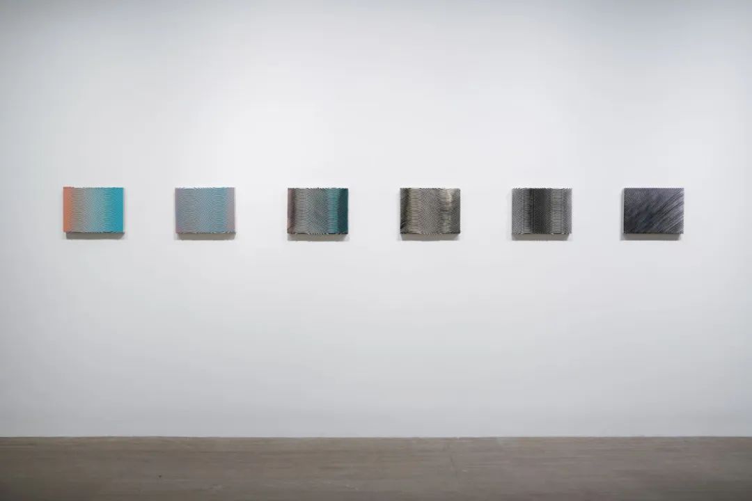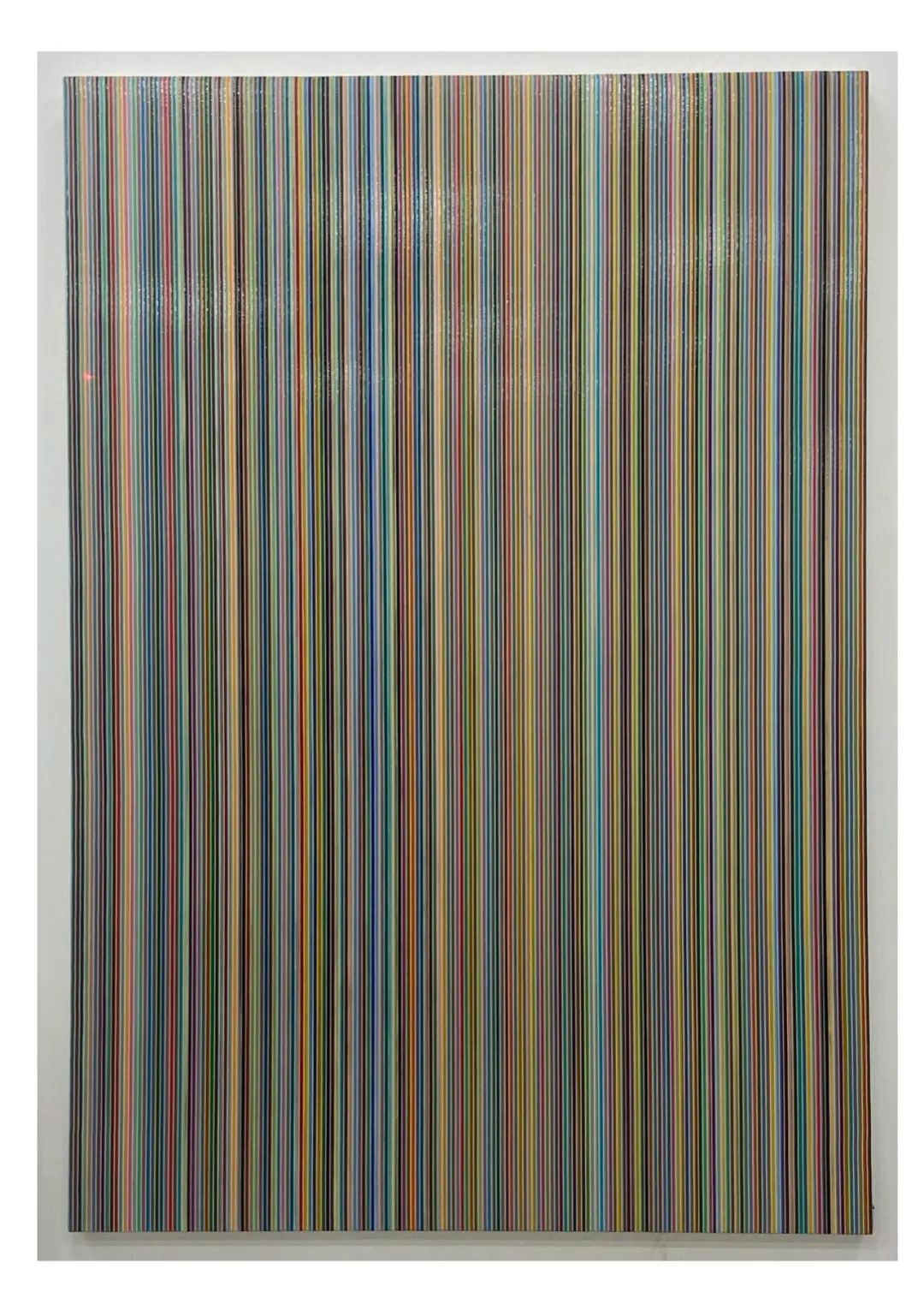 而“彩条”系列作品则受到美国和英国色域绘画及欧普艺术的影响,如《彩条·敦煌13.6.9》(2013)用丙烯媒介剂,创造出独特的半透明效果,并通过白线结构增强画面的深度。作品中的“不连续输出”系列采用刮刀直接接触画布,以条纹肌理呈现。系列中还有小尺寸的油画则利用双层油画颜料,通过锯刀塑形,增强细节变化。