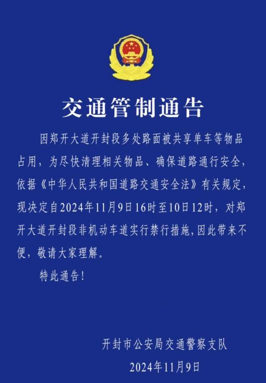 郑州交警、开封交警于9日陆续发布交通管制提醒。