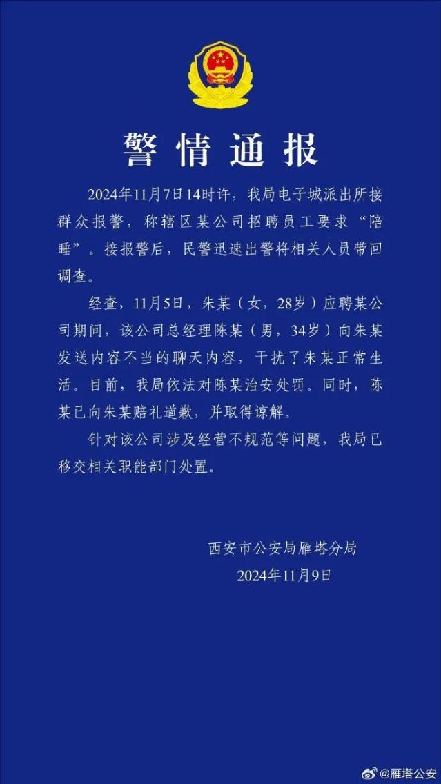“女子试岗第一天被要求陪睡”,西安警方最新通报