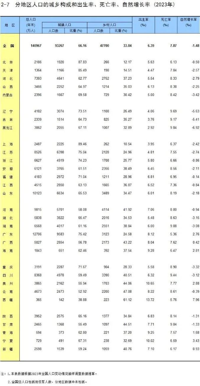 从人口自然增长率来看,有23个省份为负,比2022年增加3个。