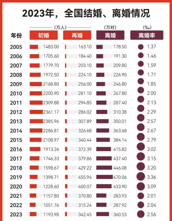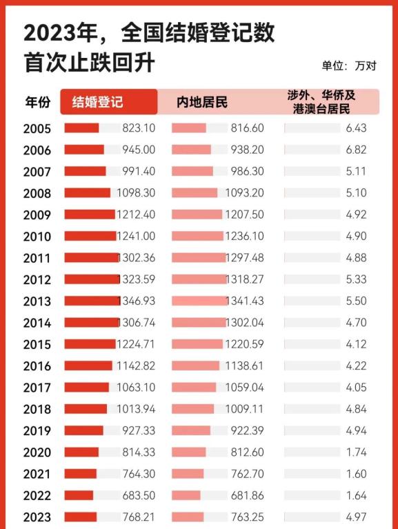 统计数据显示,2023年全年,全国结婚登记768.21万对,离婚登记360.53万对。