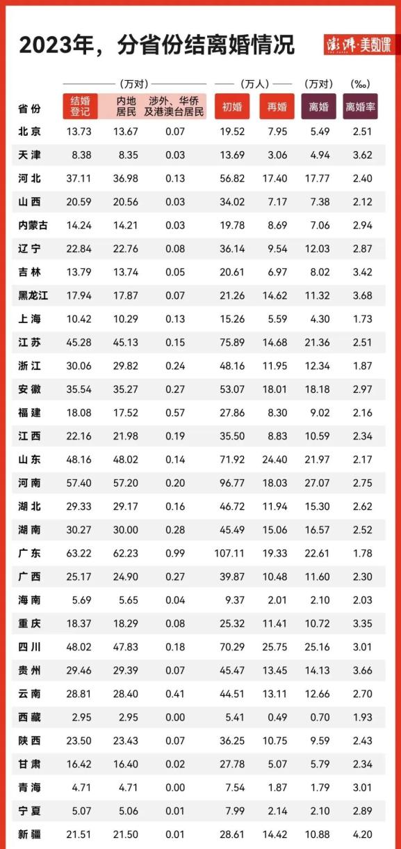 分省份数据来看,2023年,广东初婚人数达107.11万人,是全国唯一初婚人数破百万的省份。2023年,陕西初婚人数达36.25万人,再婚人数达10.75万人,离婚率为2.43‰。