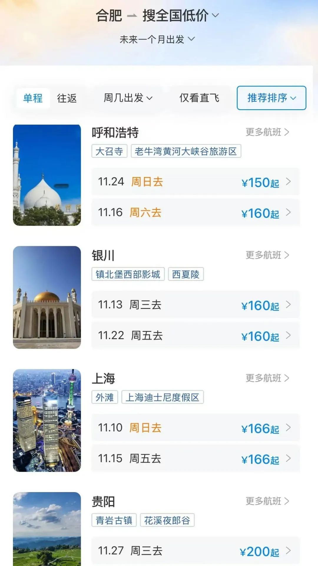 记者查询到,11月从合肥飞往呼和浩特、银川、上海、贵阳等地的直飞机票价格最低只要150元起。