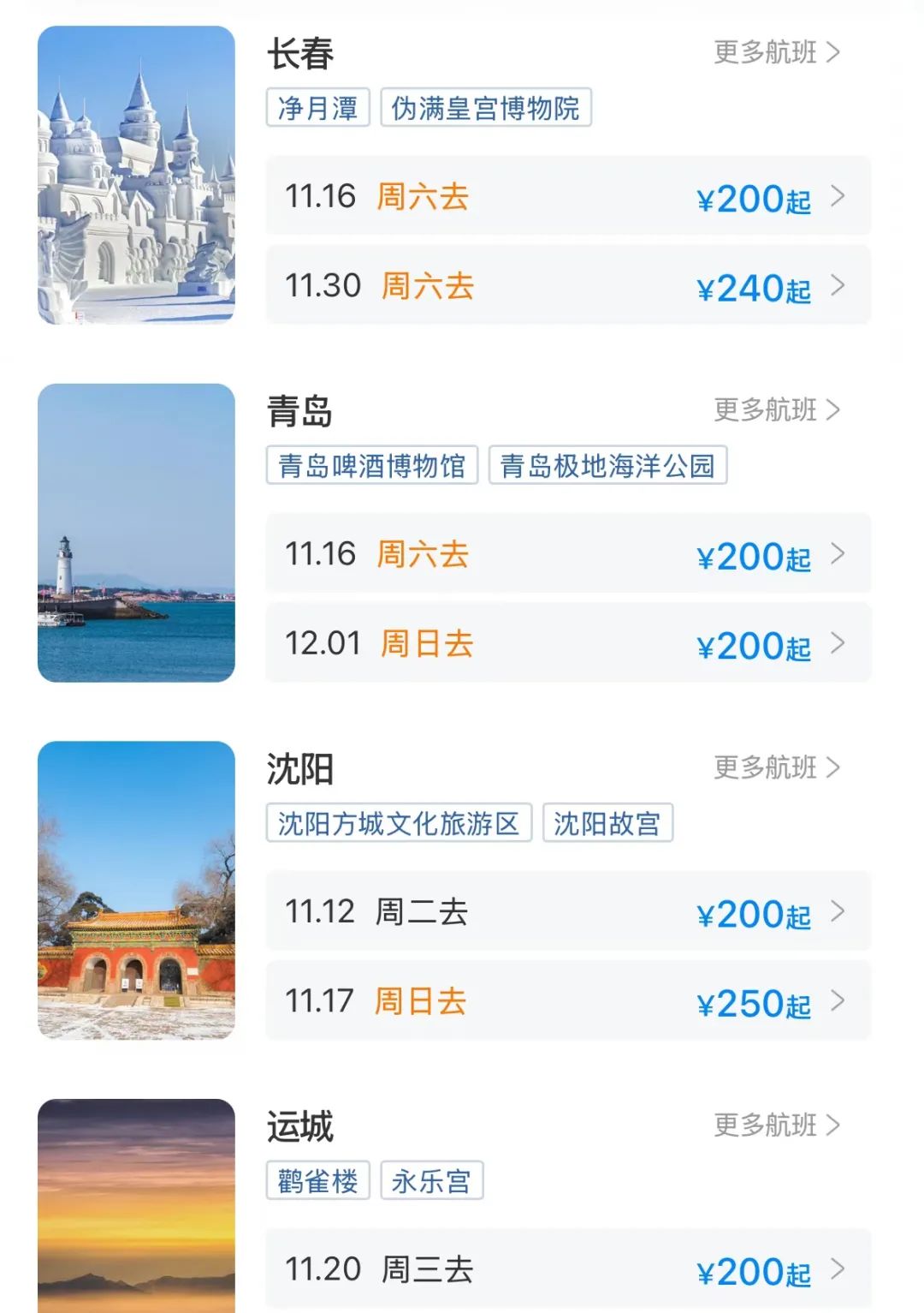 飞往长春、青岛、沈阳等地,最低价格在250元内。