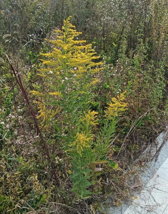 大部分的“加拿大一枝黄花”植株比较高大,能长到快两米,在土地上疯狂生长,其他植物都被挤得没有容身之地。本土的一枝黄花,在“恶霸”的衬托下,都显得比较低矮、柔弱。