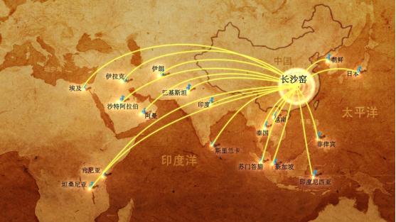 2019年长沙加入海丝申遗城市联盟,拓展了海上丝绸之路的文化内涵,丰富了海丝申遗的历史底蕴。被列入“海上丝绸之路·中国史迹”预备名单遗产点的长沙铜官窑,是唐代长沙著名的制瓷窑址、是世界釉下多彩陶瓷的发源地,产品远销至东亚、东南亚、中亚、西亚和北非的20多个国家和地区。2017年5月习近平主席在“一带一路”国际合作高峰论坛开幕式上提到的千年沉船“黑石号”,就装载了5.6万件产自长沙铜官窑的瓷器。长沙铜官窑瓷器无论在器型还是在纹饰等方面都兼具东方及以中亚、西亚为代表的西方艺术气质,这证明在距今1200多年前,深处内陆的长沙已然与海外开始了深刻的技艺交融与文化交流。