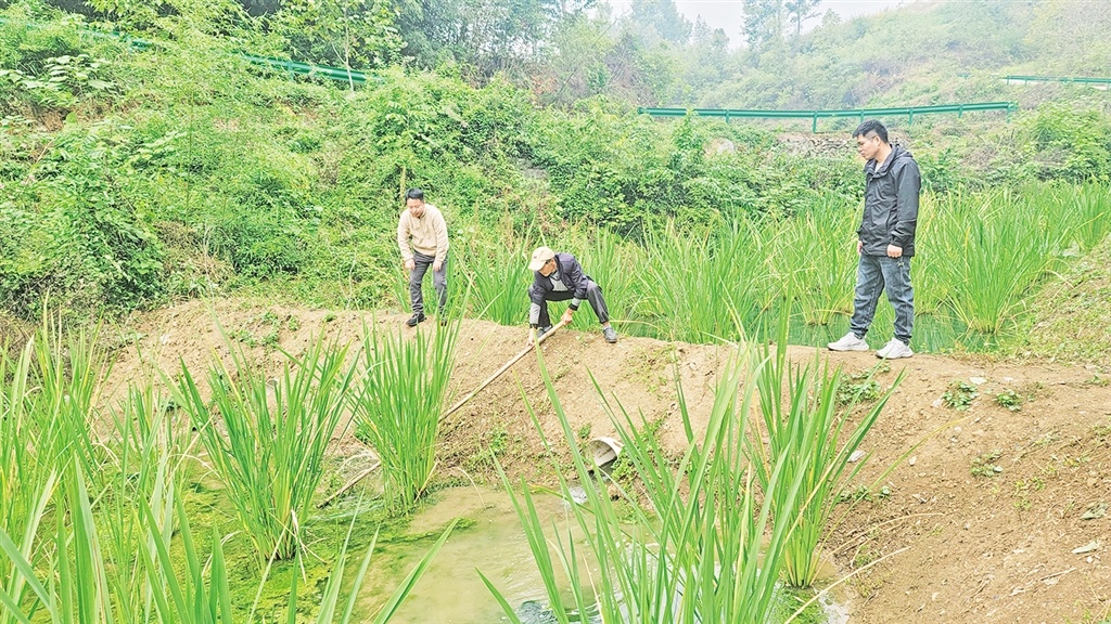 说干就干,顺流排列的12个水塘一天天建好,河水在桥下被全部拦截到水塘中,每个水塘都种上了茭白。他们还在当地发展起志愿服务队,负责日常种植和维护管理。