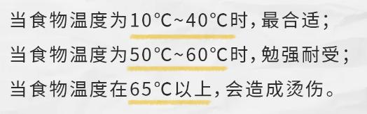 食道黏膜最适宜的食物温度在10℃至40℃,65℃以上会造成烫伤。