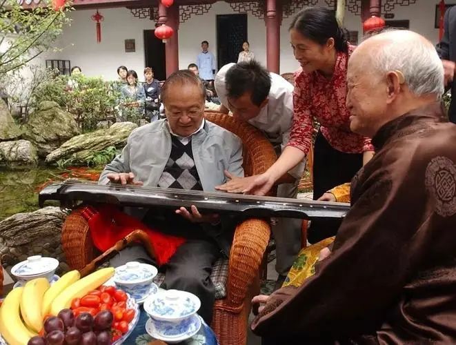 金庸(左一)与古琴演奏家俞伯荪(右一)
