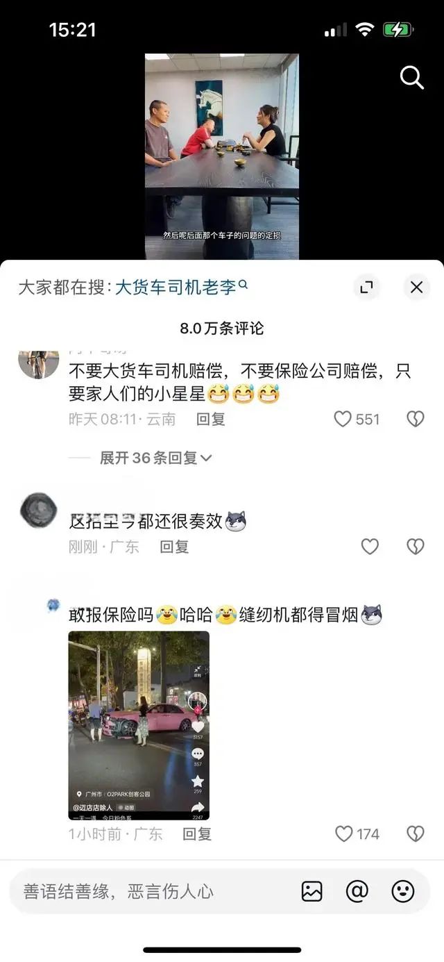 事发后,劳斯莱斯车主和货车司机达成和解,双方互道感谢,并录视频发布在社交媒体平台,但评论区也有不少网友认为此次车祸是剧本,有摆拍嫌疑。