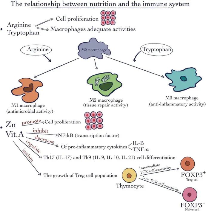 营养元素与免疫系统之间的关系图丨来源:论文[6]具体来说,不同营养元素参与体内不同的生物化学反应,调节免疫系统。例如,上图所示,精氨酸和色氨酸等常量营养元素参与细胞增殖和巨噬细胞的各种生物活性。巨噬细胞是人体先天免疫系统的重要组成部分,能够识别、吞噬、清除致病细菌、寄生虫以及外来病原体等。精氨酸有助于巨噬细胞生成一氧化氮,随后在氧化氮合酶的作用下,所产生的一氧化氮决定了巨噬细胞在对抗致病细菌、寄生虫等抗原时的细胞毒性。而色氨酸为蛋白质合成所必需,而且通过启动因子调节巨噬细胞的抗炎症活动[6]。