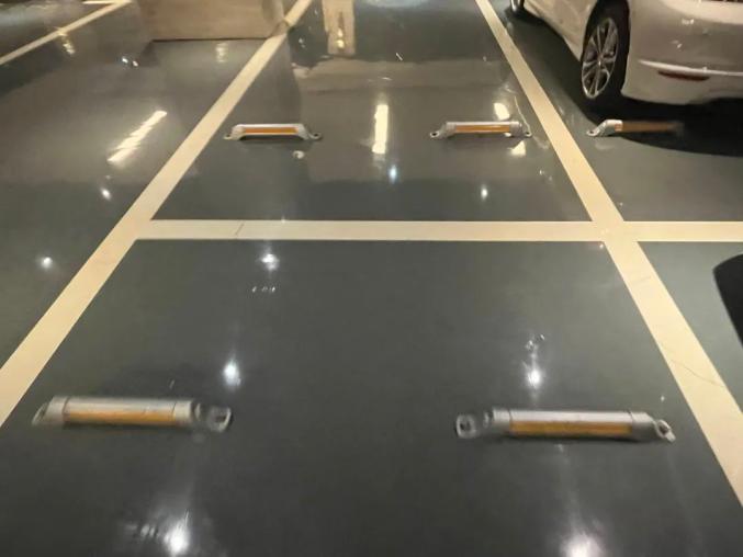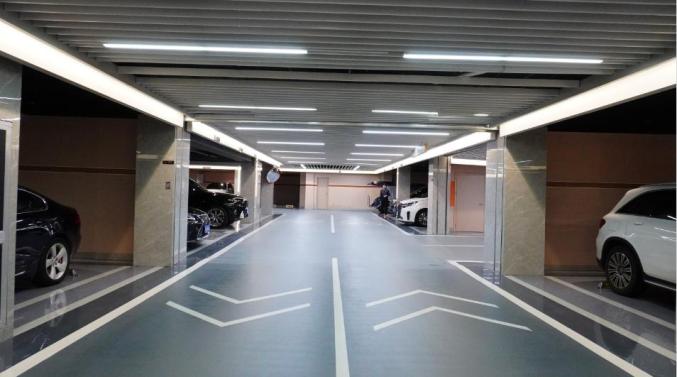 每一个车位的地面材质用了镜面的环氧树脂,防滑且耐用,不容易损耗业主车轮胎