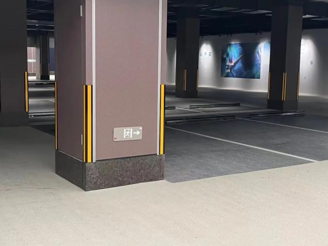车库挡车杆采用的是亮面金属材质,当光线没那么好的时候可以起到反射作用如果你注意看,会发现车库里面所有的柱子下方都贴上了金色的反光条,可以提醒业主安全停车
