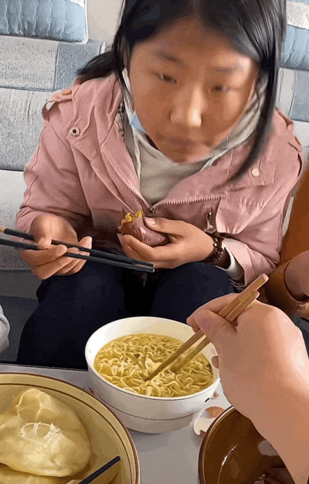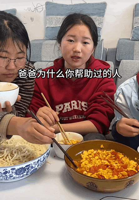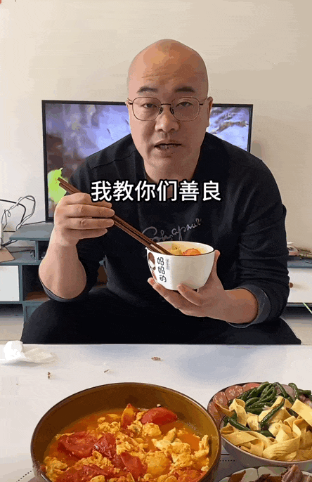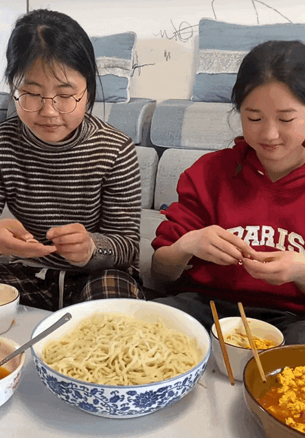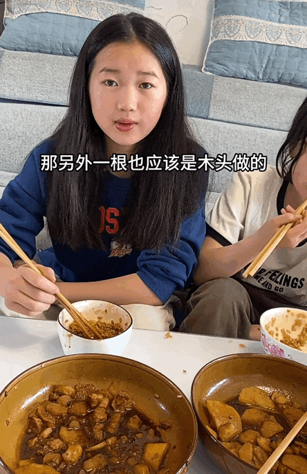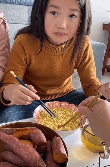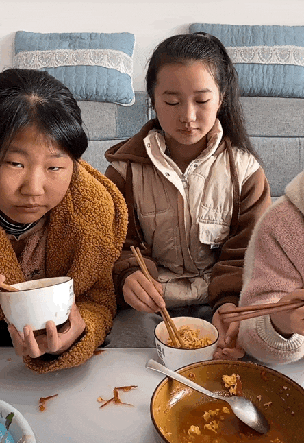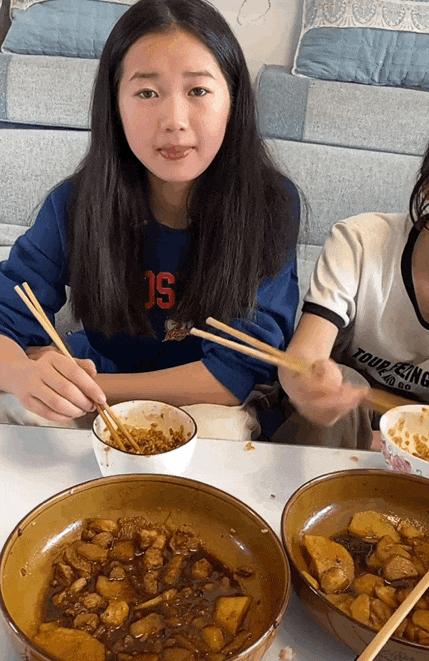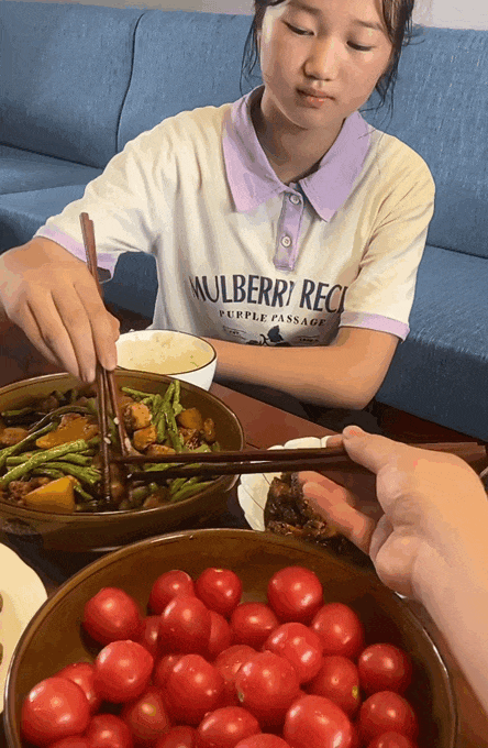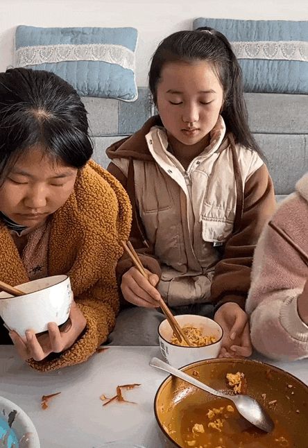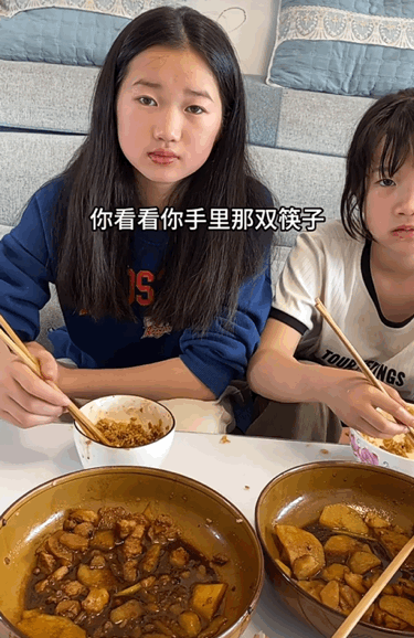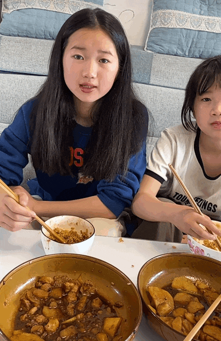 正在吃午饭,博主拿着筷子,依次缓缓伸向三个女儿的碗里。