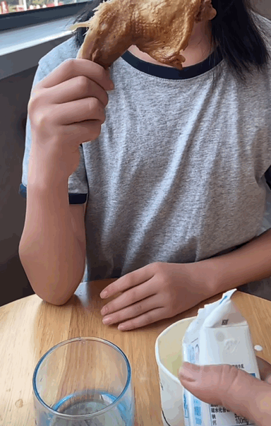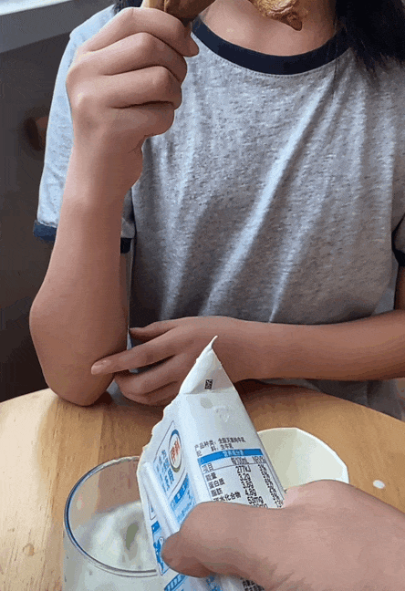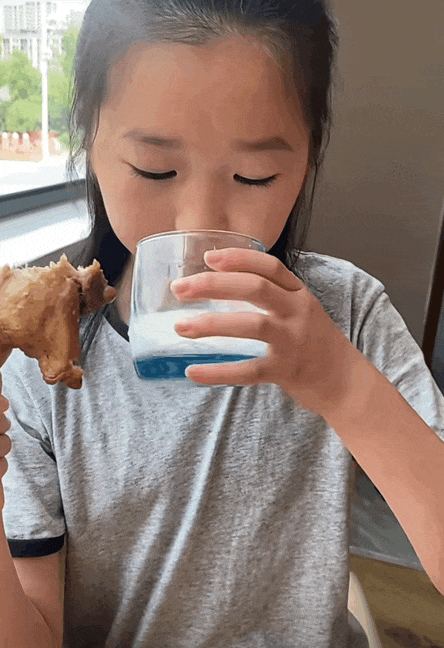 又一次选择时,女儿拿起装了牛奶的玻璃杯开始喝。