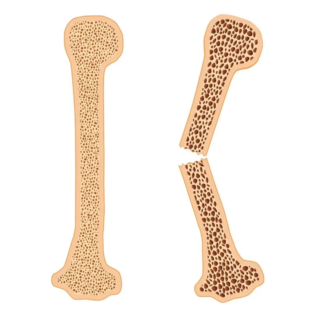 与正常的骨相比,骨质疏松患者骨孔隙增多、变薄、断裂甚至完全消失,造成骨强度下降,易发生脆性骨折。骨质疏松症早期常无明显的症状,往往在骨折发生后经X线或骨密度检查时才发现已有骨质疏松。