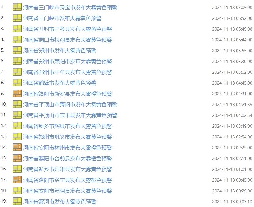 今天,漯河、三门峡、鹤壁、洛阳、安阳、濮阳、周口、新乡、荥阳等多地已发布大雾黄色预警。