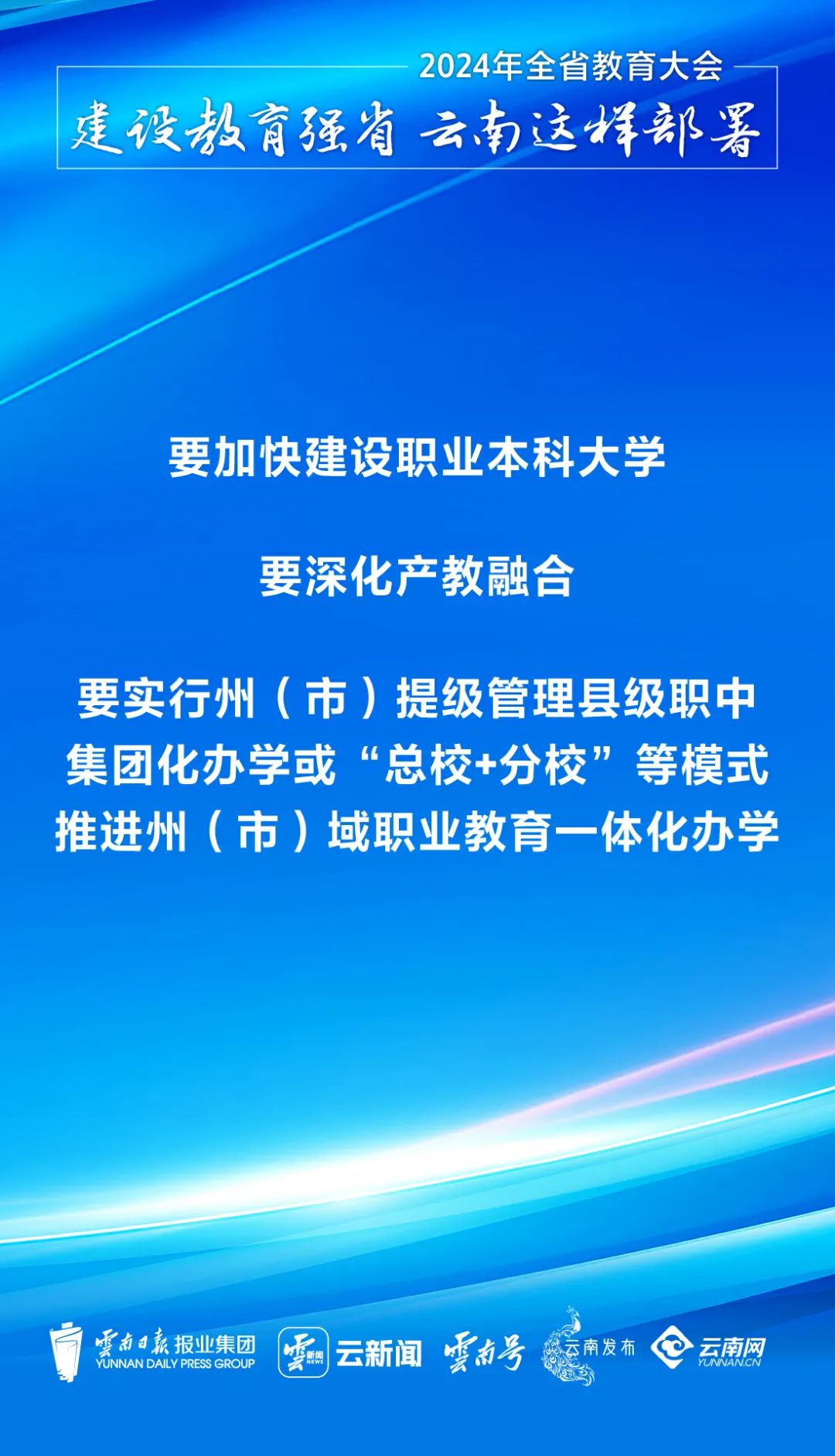 11月12日,全省教育大会在昆明召开,深入学习贯彻党的二十届三中全会精神和习近平总书记关于教育的重要论述,全面落实全国教育大会部署要求,谋划实施进一步深化教育综合改革举措,强调要举全力加快建设教育强省,以教育之强支撑和引领中国式现代化云南实践。