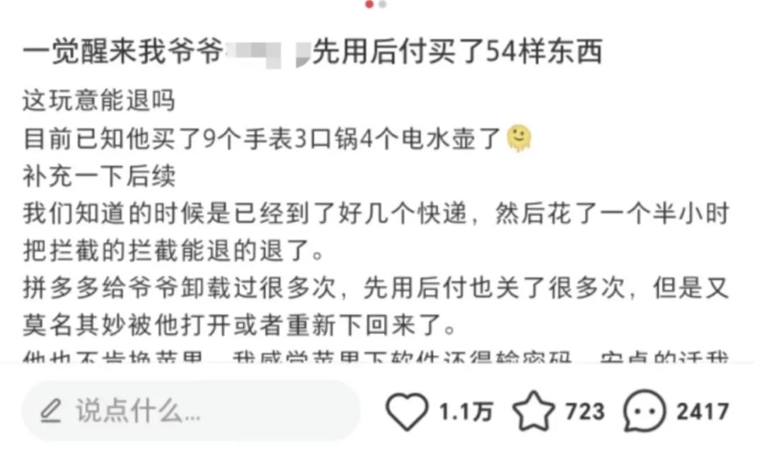 没留神开通“先用后付” 这些“套路”你中招了吗很多消费者反映,自己默认的付款方式莫名其妙变成了“先用后付”,不用输密码、刷脸或刷指纹确认就直接下单了。有的消费者只是想收藏商品或先添加到购物车,方便比价和统一结算,却变成了直接下单;也有消费者根本不知道以“先用后付”的方式购买过商品,驿站里都是自家包裹不说,后续还产生了违约金和逾期费用。比如上海的陈女士就遇到过这样的情况,她表示各大平台“先用后付”的现象十分普遍。“我本身比较排斥这些,所以不主动申请,但在支付时莫名其妙地默认选中了‘先用后付’。还曾遇到过如果不选‘先用后付’就没办法支付的情况,我只能把订单关掉。”