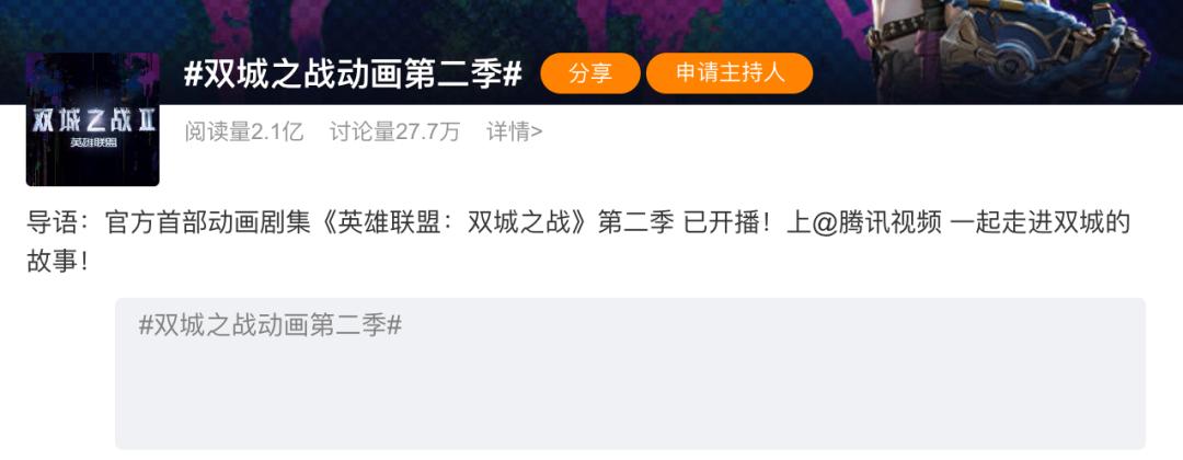 在微博,双城之战相关话题已经上了好几次热搜,单话题阅读量高达 2.1 亿。
