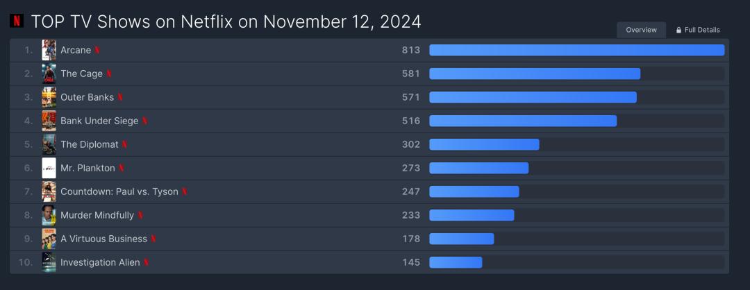 根据 FlixPatrol 平台统计,双城之战从开播首日开始就连续登顶奈飞 TV Shows 榜单。