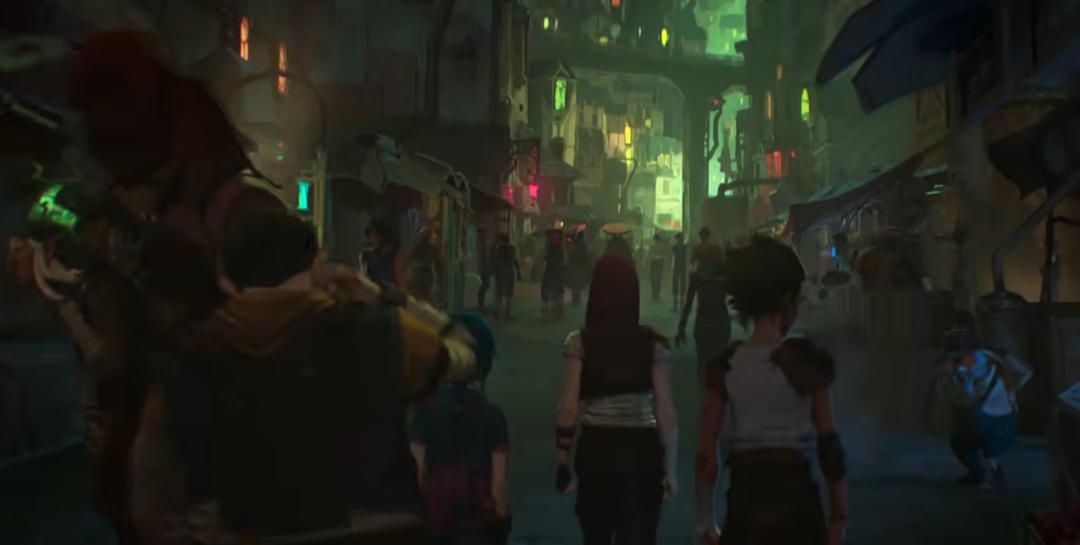 其实这是因为《 双城之战 》里很多场景的背景环境都是用手绘完成。画师要先画好场景和布景,之后再把 3D 人物放里面。