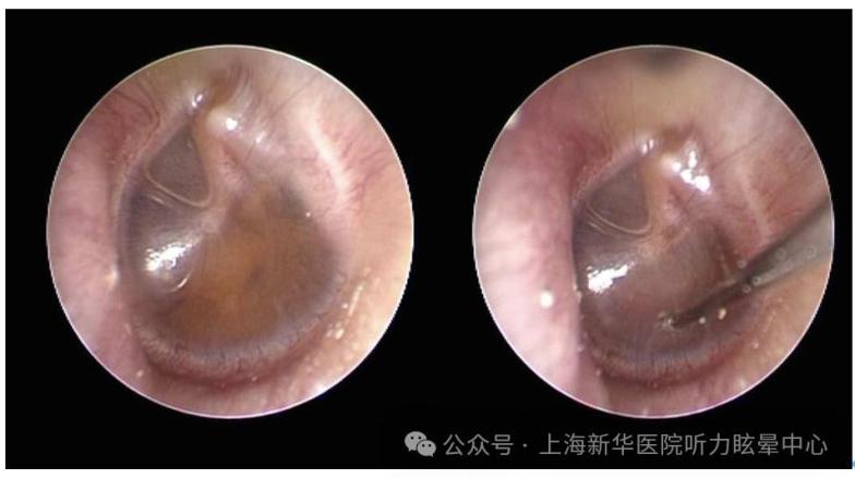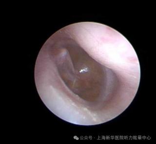 图(鼓膜置管术前,右侧鼓膜内陷呈琥珀色,鼓室内充满积液。)