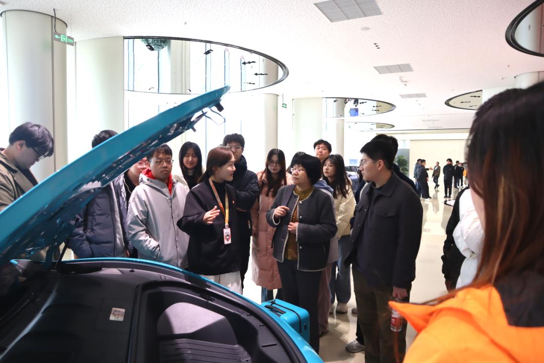 参观展厅随后,师生乘坐观光车进入小米汽车的制造车间,进一步了解小米汽车的核心生产环节。车间的自动化程度高达90%,大规模的机械化生产替代了大部分的人力劳动,机械臂有条不紊地进行铸造、加工等精密操作,运输机器人搬运着数百公斤重的零件与材料,高效的协同作业展现了科技“智”造的强大能力。讲解员细致地介绍了汽车零件的压铸和回收流程,师生对汽车工厂的生产过程有了全新的理解。