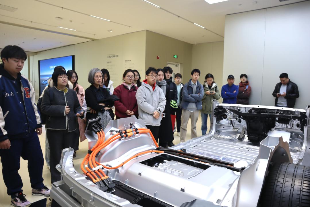 参访师生在小米超级工厂展厅合影活动伊始,讲解员带领师生参观了小米4S店的汽车展厅,详细介绍了小米SU7汽车的结构、功能和优点。汽车展厅展示了各种款式的汽车模型,同学们不仅近距离观察了小米汽车的最新款式,还进行了模拟驾驶,感受到小米汽车的卓越性能和智能驾驶体验。展厅陈列了汽车的底盘剖面模型、汽车骨架结构、发动机拆解模型、汽车与智能家居的连接系统等,在讲解员的介绍下,师生们对小米汽车的科技含量有了进一步认识。