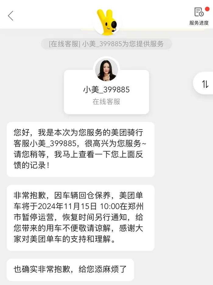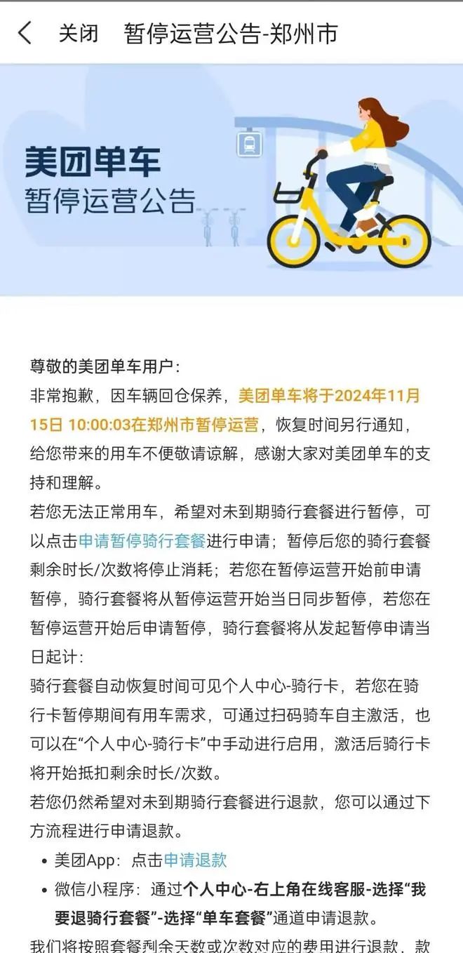 网传截图而美团单车声明称,因车辆回仓保养,美团单车将于11月15日10时在郑州市暂停运营,恢复时间另行通知。同时,美团单车提供暂停骑行套餐以及退款相关服务。
