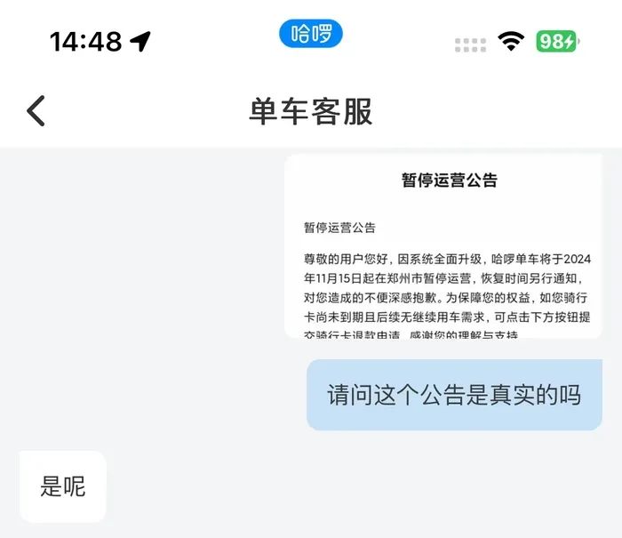 哈啰单车表示,因系统全面升级,哈啰单车将于2024年11月15日起在郑州市暂停运营,恢复时间另行通知。用户如有需求,可进行骑行卡退款。