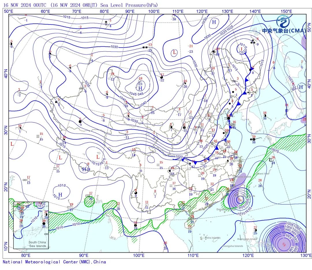 从今天早晨08时的地面天气图上我们可以看到,冷空气前锋已经抵达安徽、江苏的北部。预计这股较强冷空气将于今夜前后起影响我区,受其影响,我区将有一次明显的降温、北风增大和弱降水天气过程。