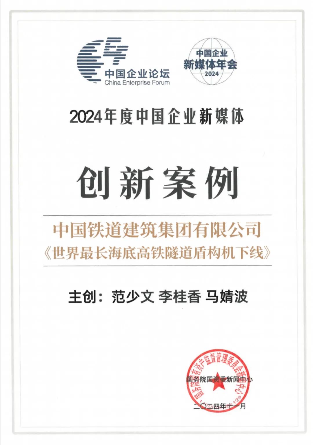 11月8日,由国务院国资委新闻中心主办的“新质赋能新传播——第十届中国企业新媒体年会”在北京召开。中国铁建《世界最长海底高铁隧道盾构机下线》获评“2024年度中国企业新媒体创新优秀案例”。