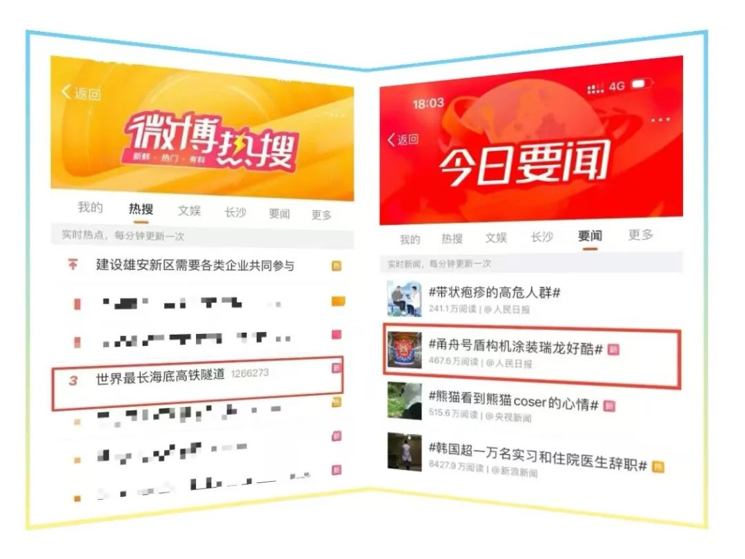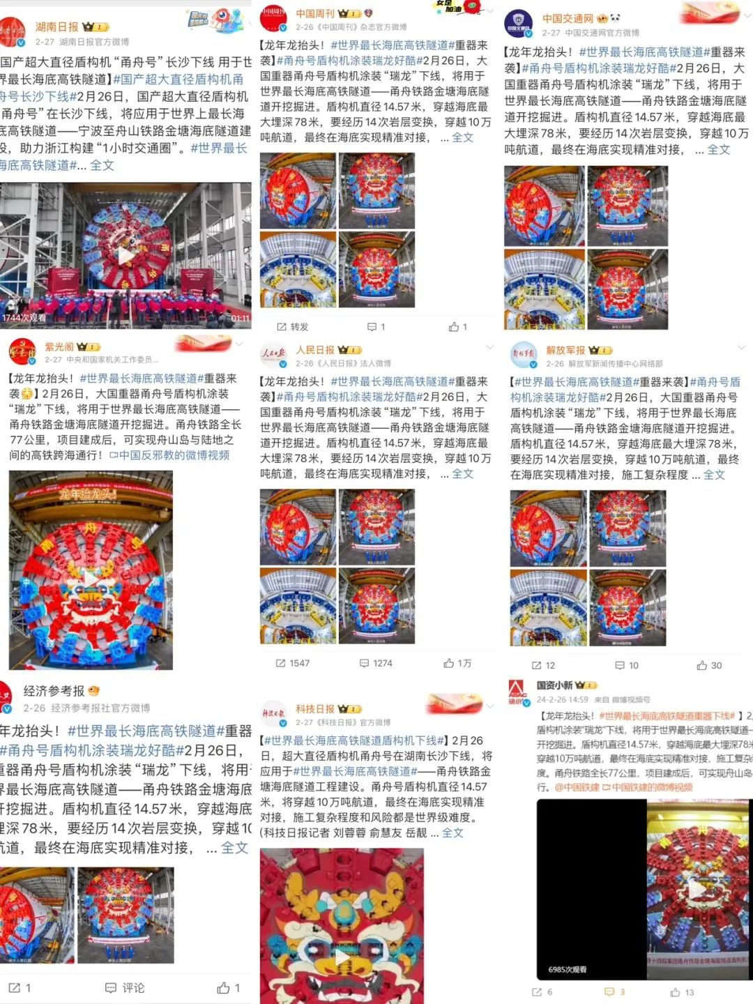 获奖证书《世界最长海底高铁隧道盾构机下线》案例聚焦微博、微信、短视频等不同新媒体平台的创新应用和协同使用,创新思维、创新表达、创新包装,通过优质内容供给、最大程度传播,达到凝聚力、影响力和传播力俱佳的目的。作品微博全网话题阅读量超3亿,登上新浪微博、百度、抖音热搜,新闻联播节目制作的“联播一瞬”视频收获10万+点赞,并在海外媒体广泛传播,达到了全方位、广覆盖、立体化、多层次的传播效果。