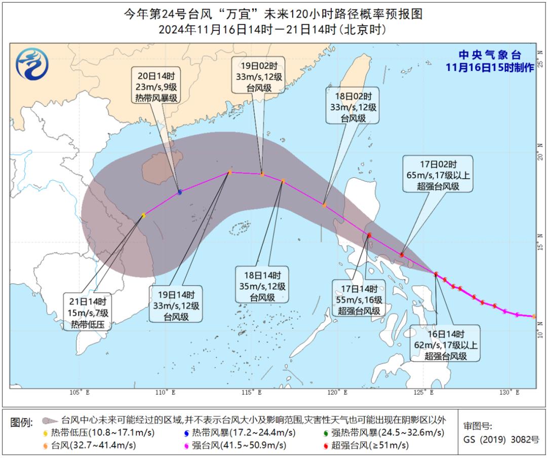 第24号台风“万宜”于15日20时加强为超强台风级,16日14时中心位于距离菲律宾马尼拉东偏南方向约530公里的洋面上,也就是北纬13.2度、东经125.7度,中心附近最大风力17级(62米/秒)。预计,“万宜”将以每小时20到25公里的速度向西偏北方向移动,强度变化不大,并逐渐向菲律宾吕宋岛东部沿海靠近,穿过吕宋岛后于18日凌晨进入南海中东部海面。