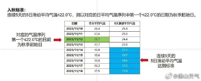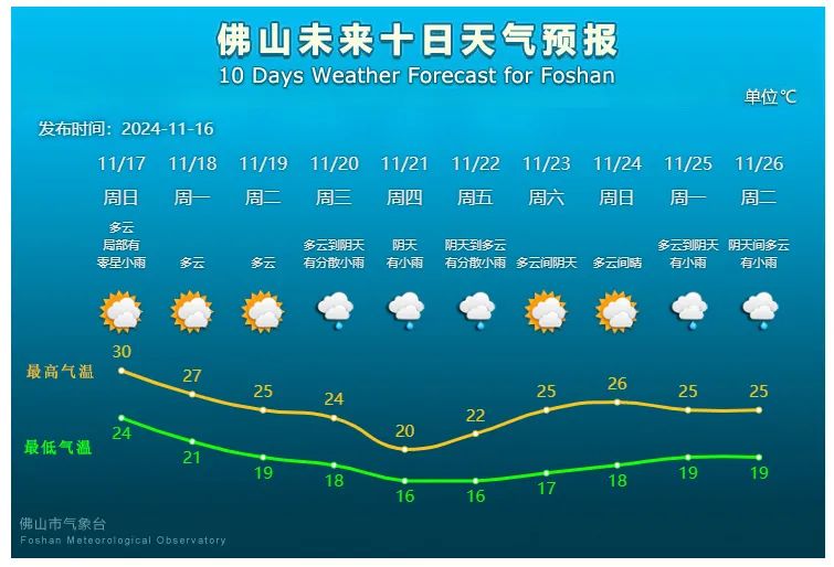 天气预报佛山市气象台预计,17日夜间起受中等偏弱冷空气影响,我市北风加大,气温持续下降,过程降温幅度5~7℃;22日前后将出现过程最低气温15-16℃,体感清凉,具体预报如下: