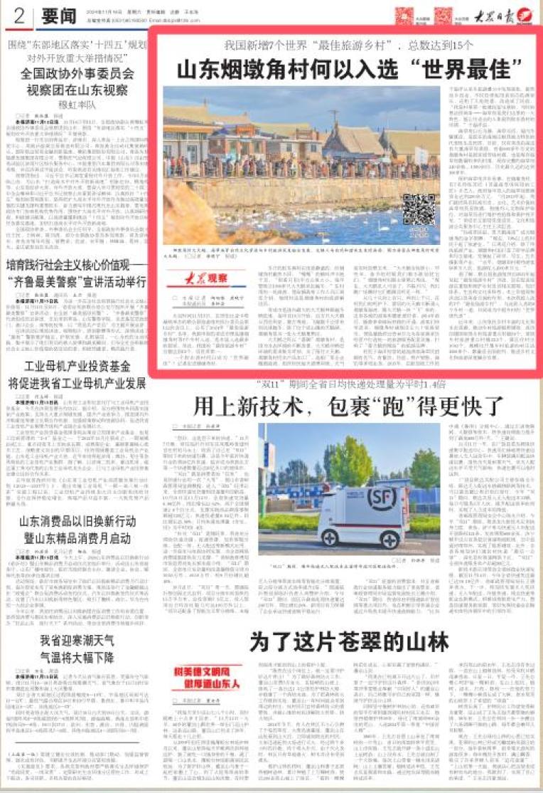 11月16日,大众日报要闻版以《山东烟墩角村何以入选“世界最佳”》为题,报道荣成市俚岛镇烟墩角村入选联合国旅游组织发布的2024年“最佳旅游乡村”榜单。