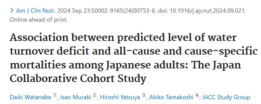 1. Watanabe, Daiki et al. “Association between predicted level of water turnover deficit and all-cause and cause-specific mortalities among Japanese adults: The Japan Collaborative Cohort Study.” The American journal of clinical nutrition, S0002-9165(24)00753-6. 23 Sep. 2024, DOI:10.1016/j.ajcnut.2024.09.021