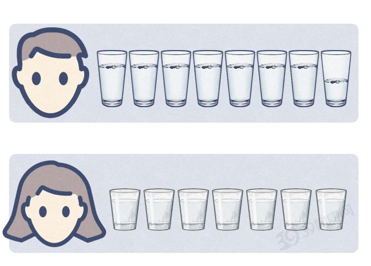 因此,换算以后,女性的最佳饮水量为每天1.28-1.4升(7杯),男性每天1.49-1.57升(7.5杯)。