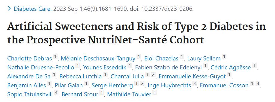 2. Charlotte Debras et al, Artificial Sweeteners and Risk of Type 2 Diabetes in the Prospective NutriNet-Santé Cohort. Diabetes Care. Doi: 10.2337/dc23-0206