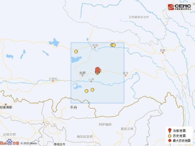 历史地震:根据中国地震台网速报目录,震中周边200公里内近5年来发生3级以上地震共22次,最大地震是2024年11月7日在西藏拉萨市墨竹工卡县发生的4.5级地震(距离本次震中2公里),历史地震分布如图。