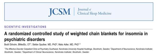[2]Ekholm B, Spulber S, Adler M. A randomized controlled study of weighted chain blankets for insomnia in psychiatric disorders. J Clin Sleep Med. 2020;16(9):1567-1577. doi:10.5664/jcsm.8636