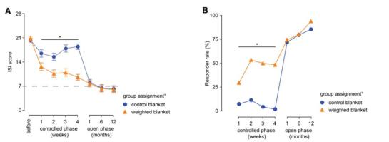 两组参与者实验前后失眠严重度指数、失眠改善有效率变化*橙色-重毛毯使用组,蓝色-对照组