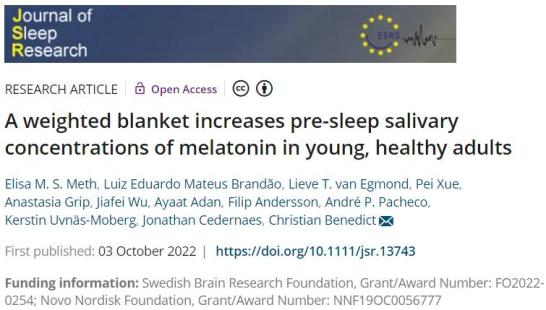 [1]Meth EMS, Brandão LEM, van Egmond LT, et al. A weighted blanket increases pre-sleep salivary concentrations of melatonin in young, healthy adults [published online ahead of print, 2022 Oct 3]. J Sleep Res. 2022;e13743. doi:10.1111/jsr.13743
