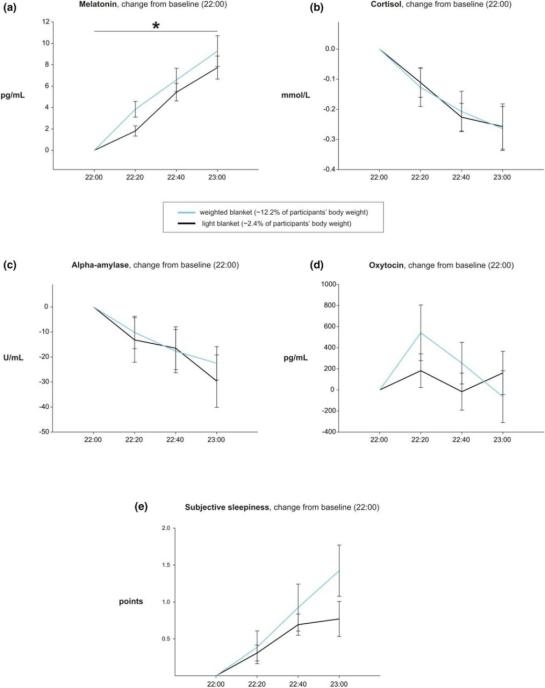 厚和轻被子对唾液中褪黑素(a)、皮质醇(b)、α-淀粉酶(c)、催产素(d)、主观嗜睡评级(e)的影响不过,对比其他激素,如皮质醇、α-淀粉酶、催产素等,却没有发现两组之间的显著差异。