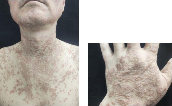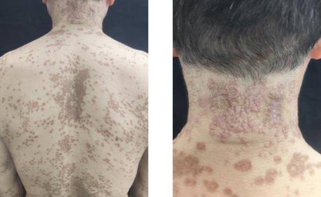 图:患者全身泛发肤色、红色丘疹,部分融合成斑块,边缘隆起呈环状。