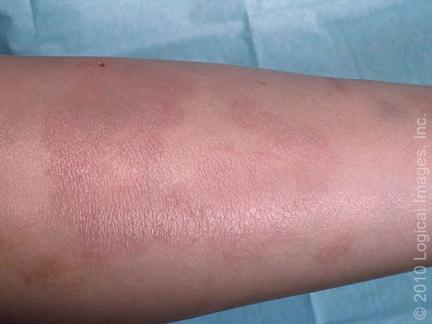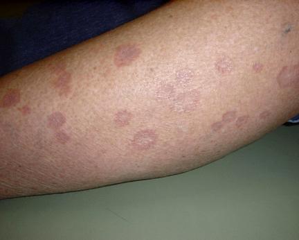 图:播散性环状肉芽肿患者,手臂、腿部和躯干上出现了 200 多个直径从 5 到 25 毫米不等的环形病灶。