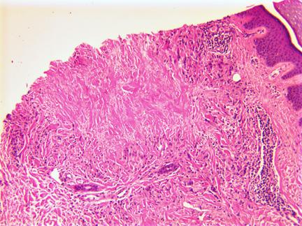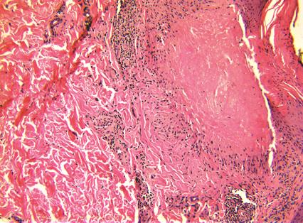 图:坏死肉芽肿位于真皮上部,在右侧可以看到无细胞物质刺穿表皮(HE 100x).