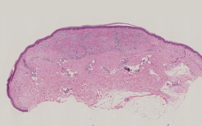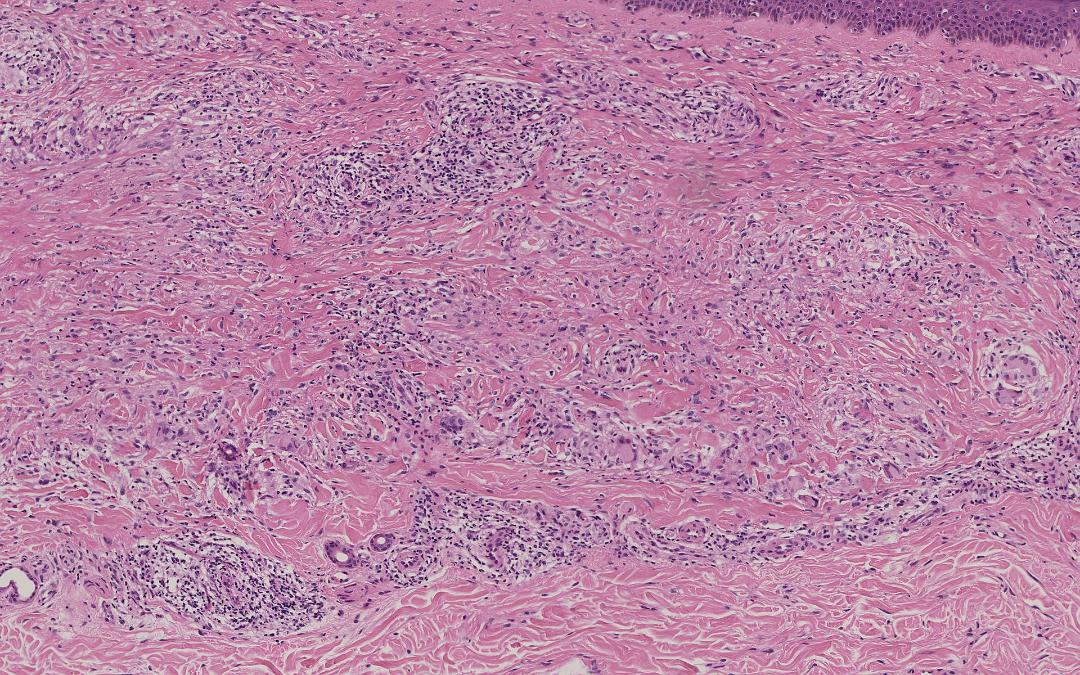 图:左下部和左上部区域的 2 个不完全胶原变性区域,中间有大面积的正常真皮胶原(间质或不完全环状肉芽肿)。(HE染色 100x)