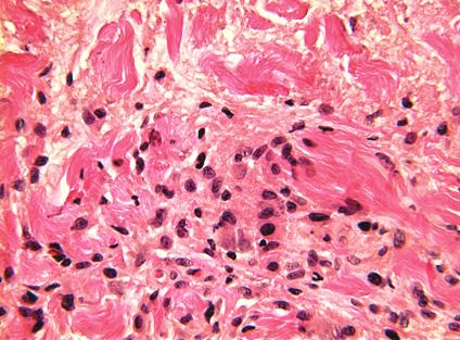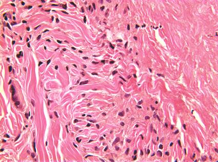 图:上部坏死区显示微弱的嗜碱性粒细胞,代表细胞、纤维、嗜酸性粒细胞物质束间的粘液变性。边缘见组织细胞和一些淋巴细胞,伴有正常胶原的完全粘液变性 (HE 400x).